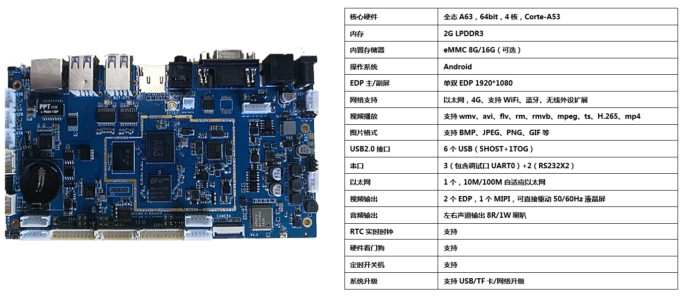 基于全志(zhì)A63平台的(de)KF07-A63智能(néng)主闆,集成多(duō)媒體(tǐ)解碼、液晶驅動、以太網、RJ11、WIFI、藍(lán)牙、功放(fàng)于一(yī)體α(tǐ),支持絕大(dà)部分(fēn)當前流行(∞xíng)的(de)視(shì)頻(pín)及圖片格式解碼,支持雙EDP高(gāo)清雙屏異顯/同顯。适用(yòng)于智能(néng)POS機(jī),雙屏廣告機(jī),雙屏收銀(yín)機(jī),觸摸一(yī)體(tǐ)機(jī)等産品∞高(gāo)集成度:集成USB/RJ11/串口/以太網/WIFI于一(yī)體(tǐ),簡化(huà)整機(jī)設計(jì),可(kě)插TF卡。